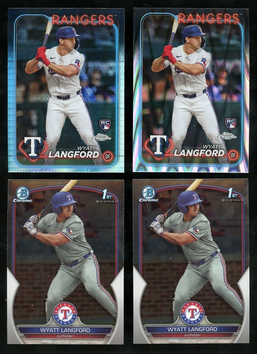 Lot of 13 Wyatt Langford Rookie Cards (Bowman Chrome & Topps Chrome) - Lot includes (8) 2023 Bowman Draft Chrome RC #BDC106, (3) 2024 Topps Chrome Checkerboard Refractor RC #122, (1) 2024 Topps Chrome Raywave Refractor #122, and (1) 2024 Topps Chrome Prism Refractor #122.  Cards are NM/MT or better.