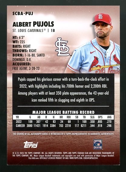 2023 Stadium Club Albert Pujols Certified Autographs #SCBA-PUJ - A great Pujols on card autograph from his retirement ceremony with the Cardinals.  NM/MT