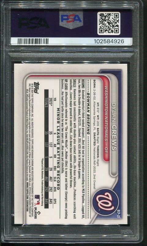 2024 Bowman Chrome Mega Box Dylan Crews Navy Refractor RC #'d/175 PSA Gem Mint 10 - One of the top prospects with the Washington Nationals, this Crews rookie is the tough Navy Blue Refractor serial #44/175 produced. Card is a PSA 10.
