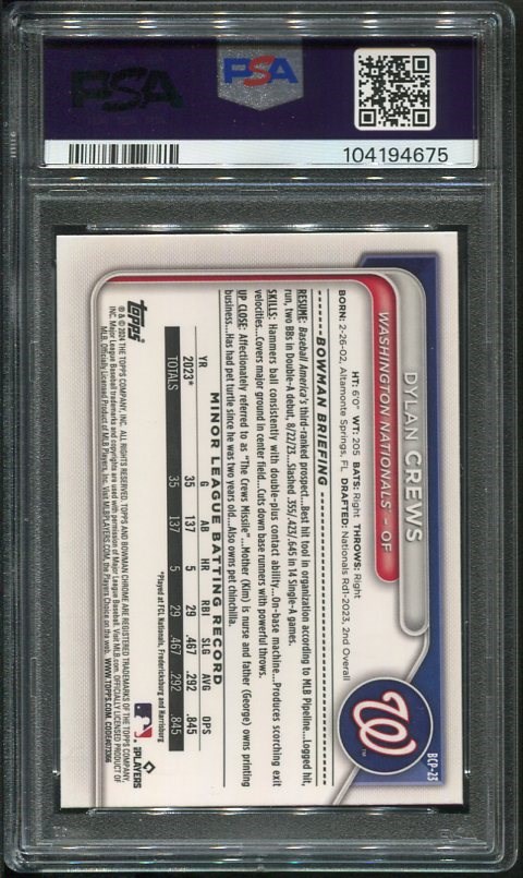 2024 Bowman Chrome Mega Box Dylan Crews RC #23  PSA Gem Mint 10 - This Crews Mega Box is a PSA 10 in a brand new holder.  A young prospect with a lot of potential!
