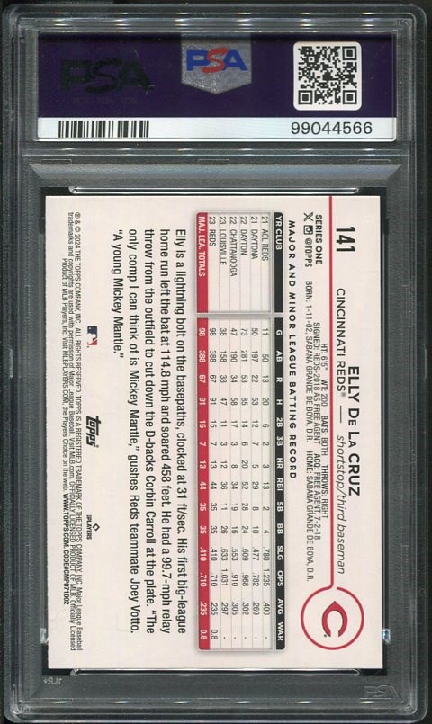 2024 Topps Elly De La Cruz RC #141  PSA Gem Mint 10 - A bit condition sensitive with it's black border design, here is a nice PSA 10 in a clean PSA holder.