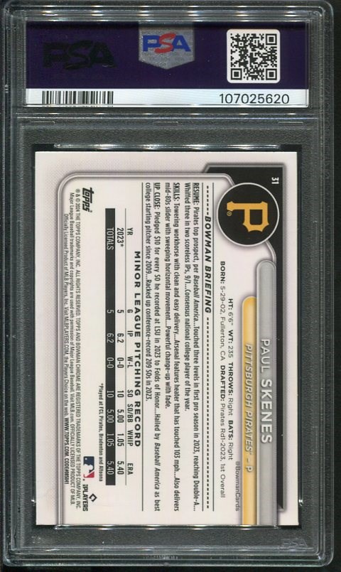 2024 Bowman Chrome Sapphire Edition Paul Skenes RC #31 PSA Gem Mint 10 - This great sapphire design has been a hit with collectors. The Paul Skenes rookie is no exception. Grab it before it is gone!