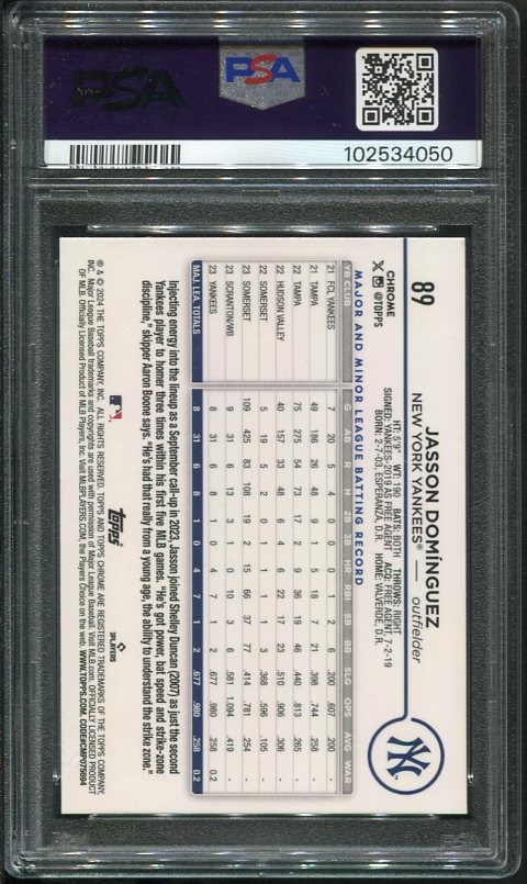 2024 Topps Chrome Jasson Domiguez Green Sonar Refractor RC #89 #'d/99 PSA Gem Mint 10 - This is serial #53/99 produced of a very attractive Domiguez issue.