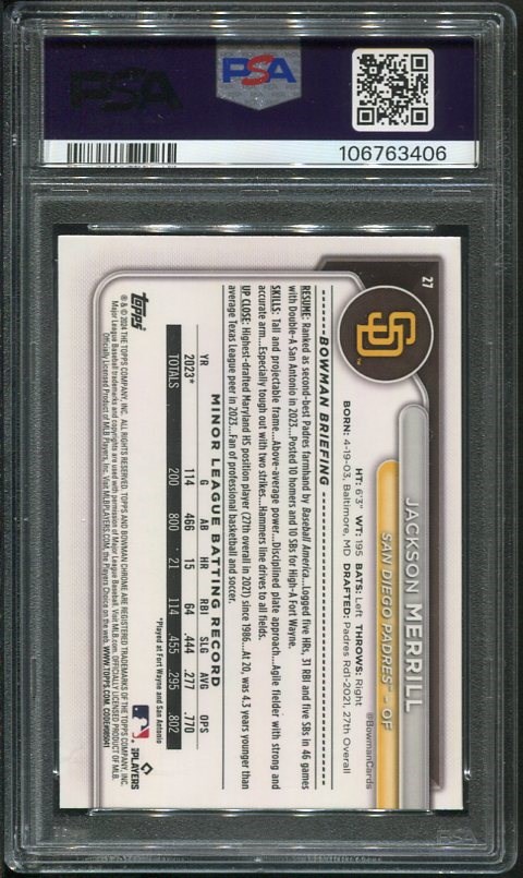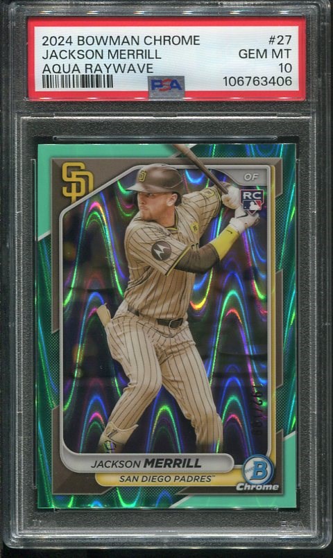 2024 Bowman Chrome Jackson Merrill Aqua Raywave RC #27 #'d/199 PSA Gem Mint 10 - Here is a low population Jackson Merrill Aqua Raywave from the 2024 Bowman Chrome product. The card is serial #192/199 made and is graded PSA Gem Mint 10.