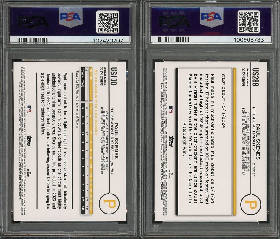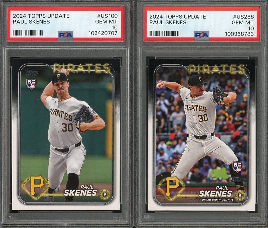 Paul Skenes 2024 Topps Update RC #US100 and #US288 Both in PSA Gem Mint 10's - A nice pair of Skenes cards from the 2024 Topps Update product, both are PSA Gem Mint 10's.