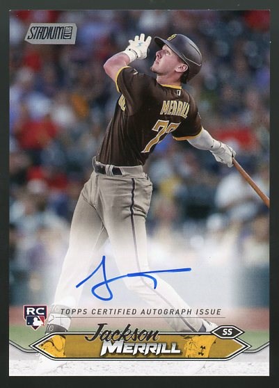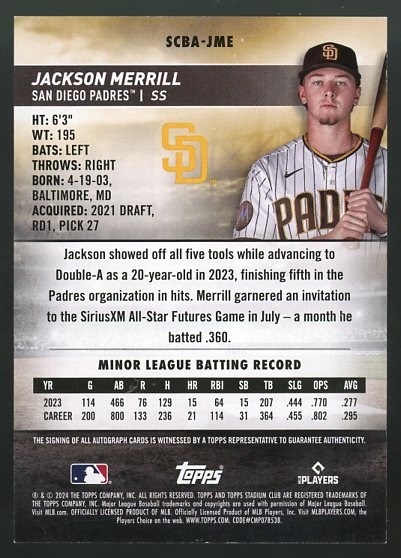 2024 Stadium Club Jackson Merrill Rookie Autograph #SCBA-JME - A nice on-card rookie signature by Merrill on his 2024 Stadium Club issue. Card is NM/MT.