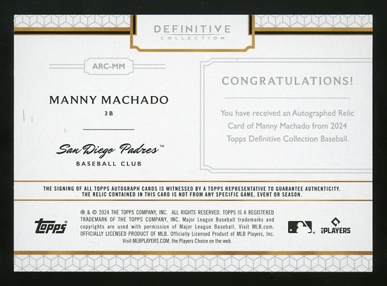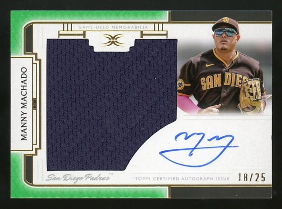 2024 Topps Definitive Collection Manny Machado Jumbo Game Jersey Autograph #MM #'d/25 - A huge navy blue jersey swatch compliments the blue ink autograph by Machado. The card is serial #18/25 produced and is NM/MT with a mint autograph.