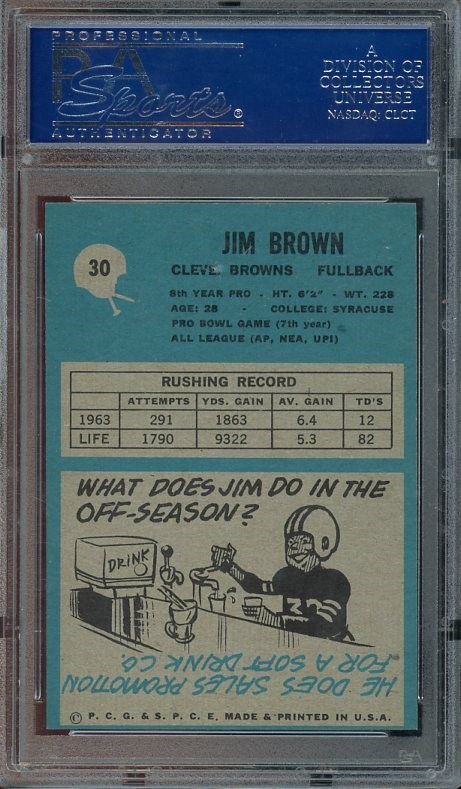 1964 Philadelphia Jim Brown #30  PSA EX 5 - This Jim Brown card really pops, with strong original color and near perfect registration.  Centering side to side is right on, but the card is off top to bottom resulting in the PSA EX 5 grade.  Corners are sharp front and back and the card is crease free.