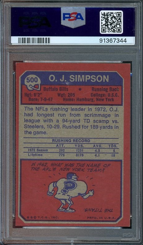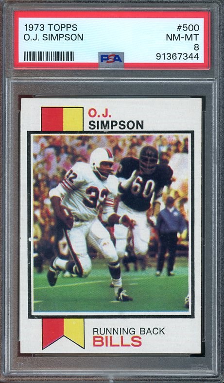 1973 Topps O.J. Simpson #500  PSA NM/MT 8 - Here is a high grade card of Simpson from the 1973 Topps set.  Card has several NM/MT qualities and comes in a scratch free PSA holder.