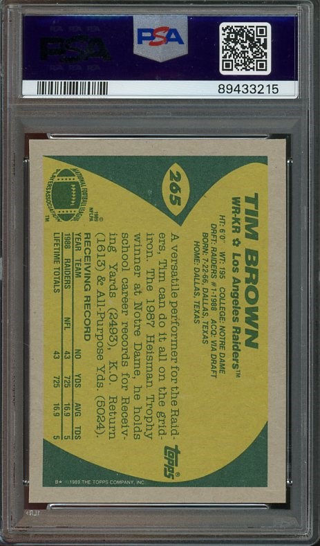 1989 Topps Tim Brown RC #265 PSA Gem Mint 10 - A tough card to find with nearly half as many PSA 10's in existence when compared to his popular 1989 Score rookie. Add this beauty to you Hall of Fame rookie collection!