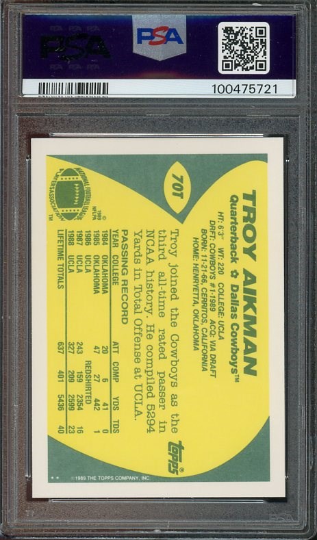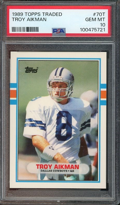 1989 Topps Traded Troy Aikman RC #70T  PSA Gem Mint 10 - A popular rookie card of Aikman that is graded PSA 10 and comes in a scratch free PSA holder.