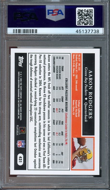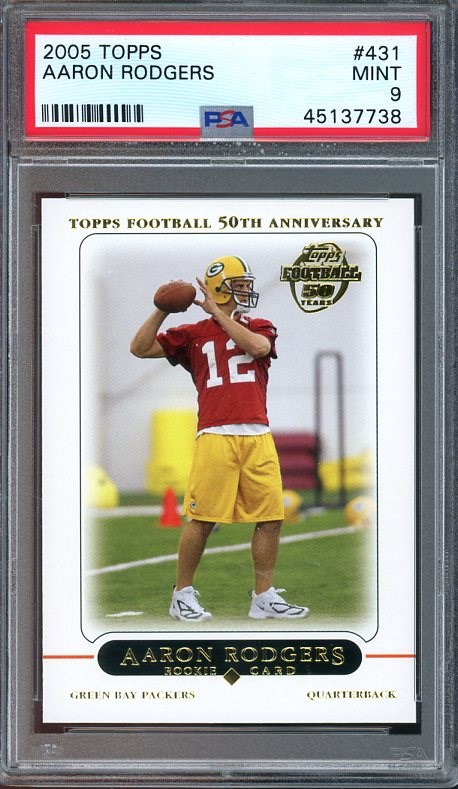2005 Topps Aaron Rodgers RC #431 PSA Mint 9 - Aaron Rogers cards have been on a roller coaster ride over the last few years. A fresh start with the Steelers might put him back on the hot list. Here is his 2005 Topps rookie card in PSA Mint 9 grade.
