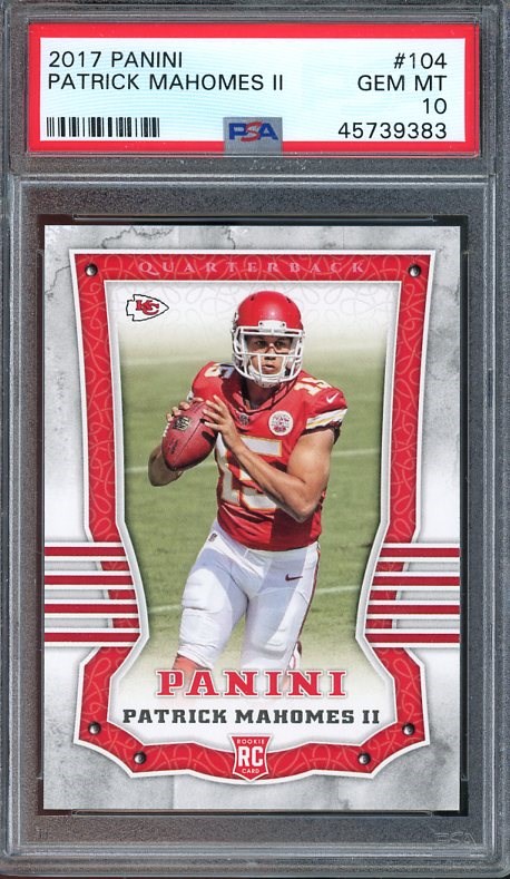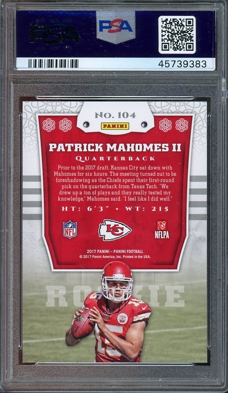 2017 Panini Patrick Mahomes II RC #104 PSA Gem Mint 10 - Mahomes has five Super Bowl appearances in seven years as a starter for the Chiefs. Still just 29 years old, Mahomes is already putting up career numbers that surpass other Hall of Fame QB's.