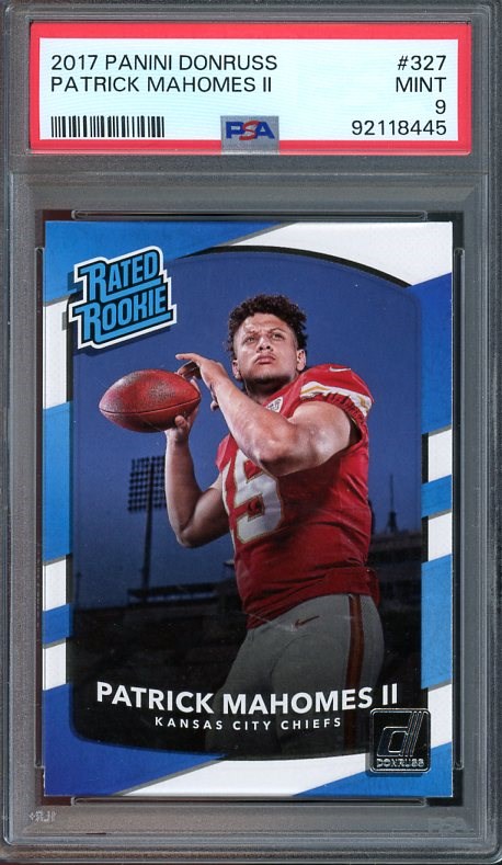 2017 Panini Donruss Patrick Mahomes RC #327  PSA Mint 9 - The Donruss "Rated Rookie" of Mahomes is one of his most popular RC's with collectors.  It is a bit more condition sensitive than most of his rookies with it's dark blue colored front and gray back.  Here is a Mint 9 by PSA up for auction.