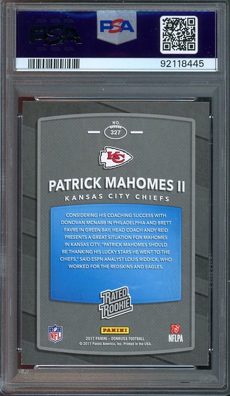 Lot # 689: 2017 Panini Donruss Patrick Mahomes RC #327 PSA Mint 9