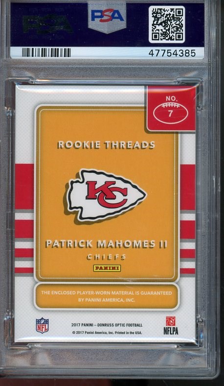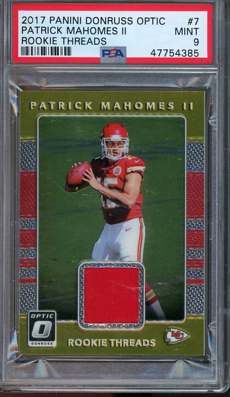 2017 Panini Donruss Optic Patrick Mahomes Rookie Threads #7  PSA Mint 9 - The 2017 Rookie Threads design was quite popular with collectors.  This high demand Mahomes rookie features a Chiefs red swatch and was graded a Mint 9 by PSA.  Don't miss out on a great Mahomes item!