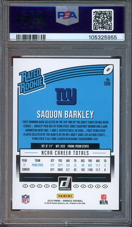 2018 Panini Donruss Saquon Barkley RC #306 PSA Gem Mint 10 - Barkley was the hottest player in the NFL last season. With the Eagles looking to repeat, all eyes will be on Barkley again in 2025. Look for his cards to get a lot of attention as well.