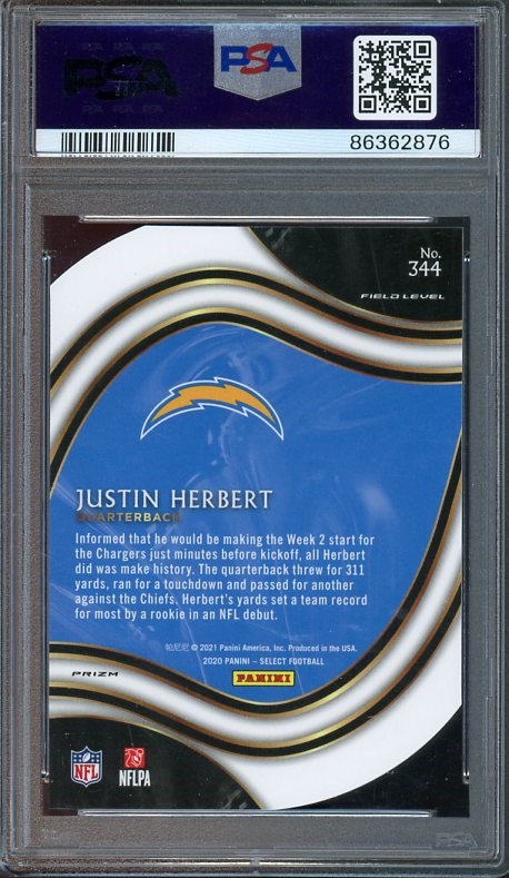 2020 Panini Select Justin Herbert Die-Cut Blue Prizm RC #344 (Field Level) PSA Gem Mint 10 - The blue background on this Panini Select design compliments Herbert's Chargers jersey. This PSA Gem Mint 10 comes in a scratch free holder and is ready to be added to your collection.
