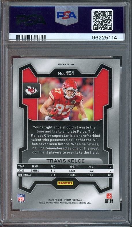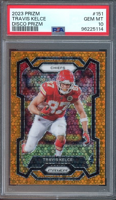 2023 Panini Prizm Travis Kelce Disco Prizm #151 PSA Gem Mint 10 (Pop 29) - A very colorful card of a very colorful player, Kelce finds himself in the news often. Here is a Disco Prizm from 2023 in PSA Gem Mint 10 grade.