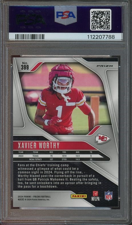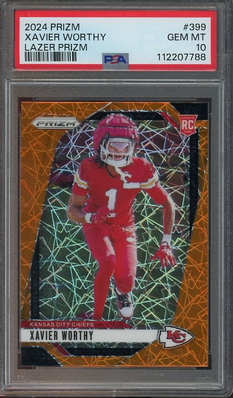 2024 Panini Prizm Xavier Worthy Lazer Prizm RC #399  PSA Gem Mint 10 - Worthy came on strong in the second half of his rookie season.  Look for him to be a part of several highlight reels during the 2025 season.