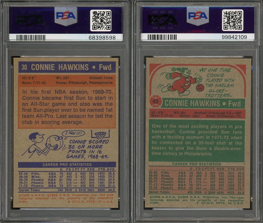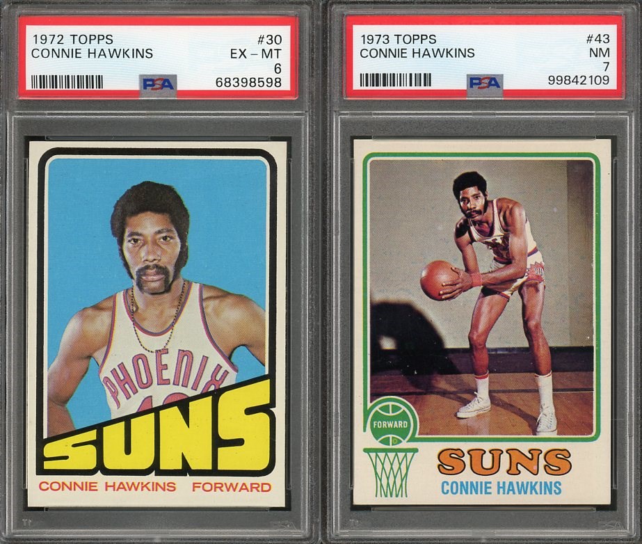 Connie Hawkins 1972 Topps #30 PSA EX/MT 6 and 1973 Topps #43  PSA NM 7 - Here is a chance to pick up two Hawkins cards in one lot. First, the 1972 Topps has great corners and exceptional surface, but centering top to bottom makes it a PSA 6.  Second, the 1973 Topps is a solid near mint card all around and comes in a new PSA holder.