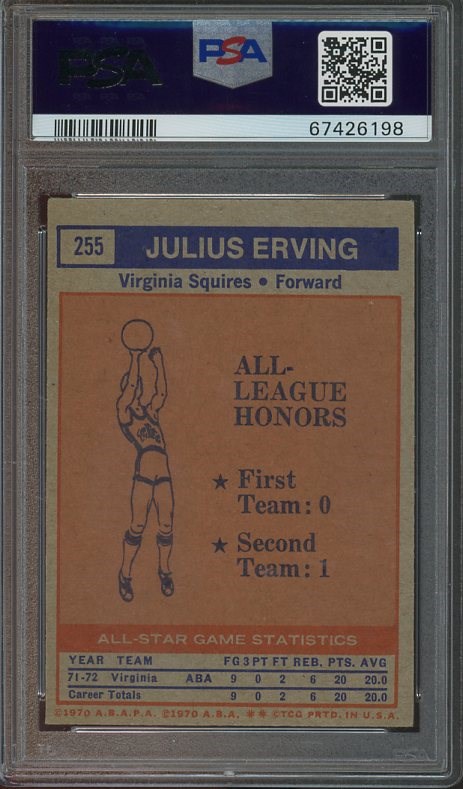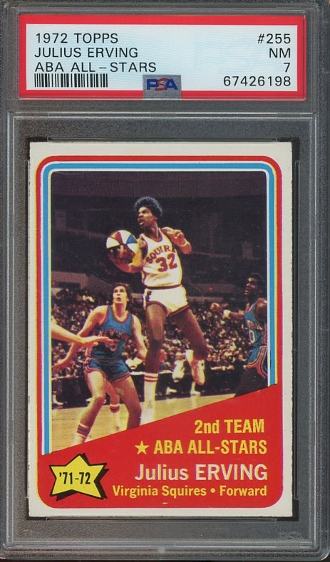 1972 Topps Julius Erving All-Star #255  PSA NM 7 - This is the second card that Erving had in his rookie set of 1972, this all-star card features him taking a classic finger roll shot during his rookie campaign with the Squires.