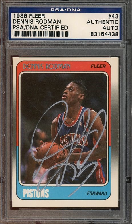 1988 Fleer Dennis Rodman RC #43 Autographed PSA/DNA Authentic - Rodman always goes big and on this rookie card, he went big with the autograph as it takes up half of the card.  Signed in silver sharpie and authenticated by PSA/DNA.  Autograph is nice, but the card has some wear coming in at VG.