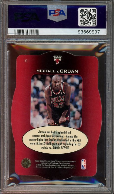 1996 SPX Michael Jordan Holoview Heroes #H1 PSA Mint 9 - A low population card when compared to most Jordan issues, this SPX Die-Cut Hologram design looks great when in high grade. This PSA Mint 9 can be yours!