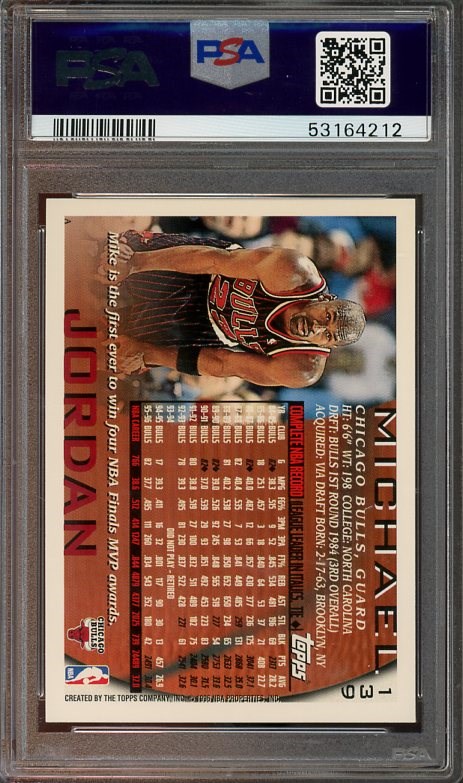 1996 Topps Michael Jordan #139 PSA Gem Mint 10 - A great card to have in your Jordan collection, this 1996 Topps issue is graded Gem Mint 10 by PSA and comes in a scratch free holder.