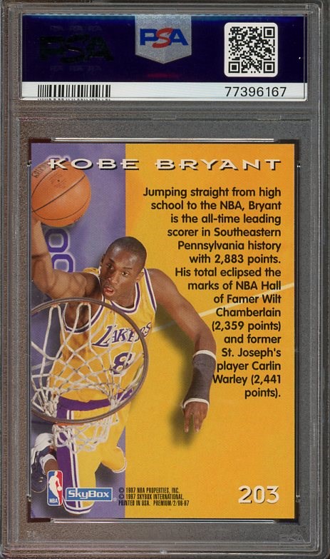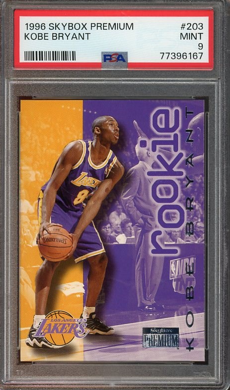 1996 Skybox Premium Kobe Bryant RC #203 PSA Mint 9 - Released in series two of the 1996 Skybox Premium release, this yellow on purple design was a great match with Kobe's Lakers jersey. An attractive card that is starting out at just $25.