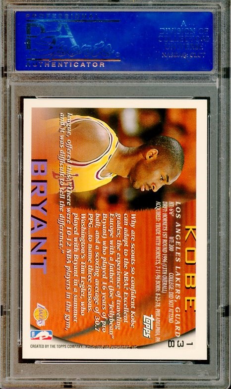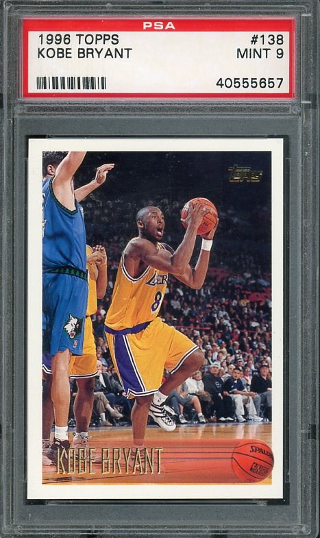 1996 Topps Kobe Bryant RC #138 PSA Mint 9 - Once thought as just another Topps product, the 1996 Topps rookie card has become one of the most desired rookie cards for Kobe Bryant. Card is more condition sensitive than you would think due to centering and surface issues.