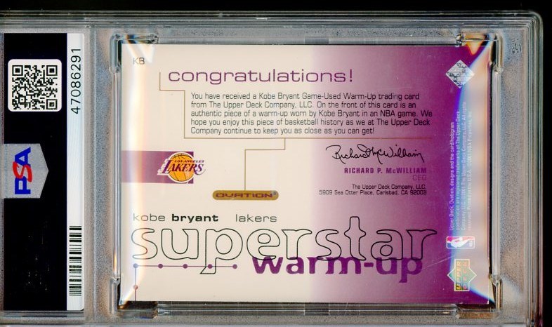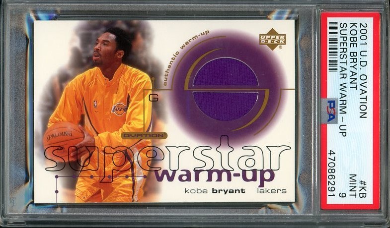 2001 Upper Deck Ovation Kobe Bryant Superstar Warm Up #KB PSA Mint 9 - Card features a nice purple swatch worn by Kobe back in the day.  Card is problem free receiving a PSA Mint 9 grade.  Every great basketball collection needs at least one Kobe relic card, so grab this great Kobe item.