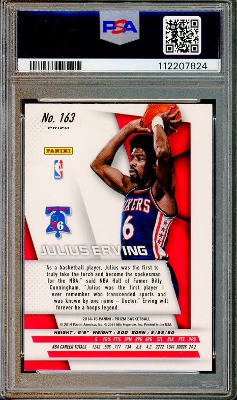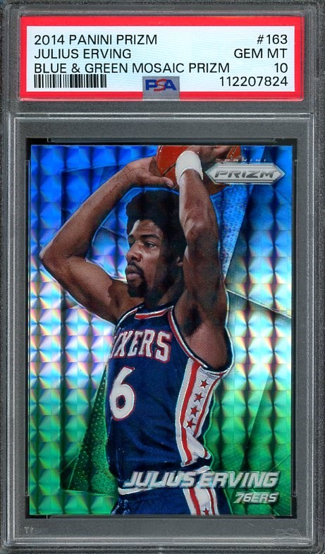 2014 Panini Prizm Julius Erving Blue/Green Mosaic Prizm #163 PSA Gem Mint 10 (Pop 3) - This highly attractive Mosaic Prizm of Erving was recently awarded a PSA 10 grade and comes in a new PSA holder. PSA 10 population of just three!