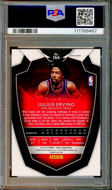 2014 Panini Select Julius Erving Silver Prizm #166 PSA Gem Mint 10 (Pop 6) - Silver Prizm's are one of the most sought after parallels coming from Panini, and here is one featuring Dr. J in PSA 10 grade. PSA 10 population is just six in existence.