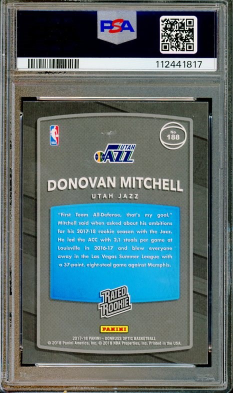 2017 Panini Donruss Optic Donovan Mitchell RC #188 PSA Gem Mint 10 -This Optic rookie card is one of the higher level brands featuring Donovan Mitchell. A very consistent producer, Mitchell has been a six-time NBA All-Star.