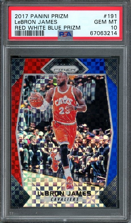 2017 Panini Prizm LeBron James Red White Blue Prizm #191  PSA Gem Mint 10 - This LeBron is from his second tenure with the Cavaliers where he won one of his NBA Championships.  Here is a Red, White, Blue Prizm in PSA Gem Mint 10 grade.