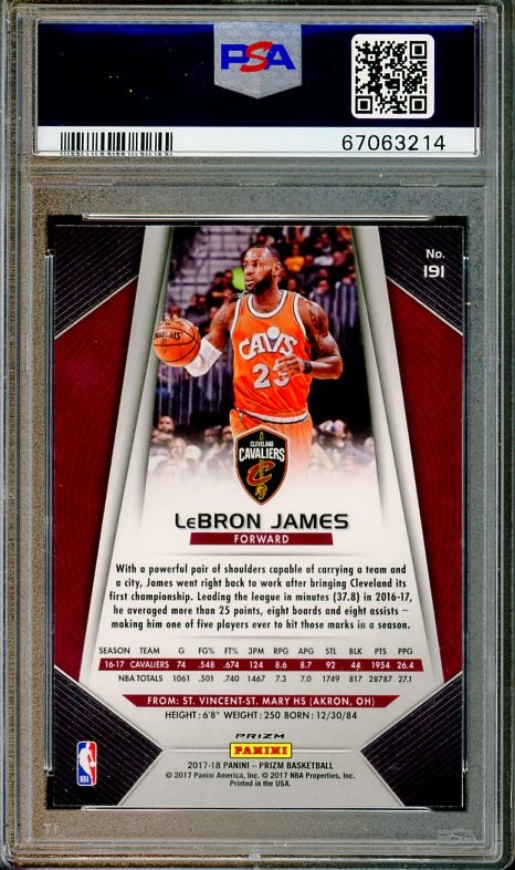 Lot # 785: 2017 Panini Prizm LeBron James Red White Blue Prizm #191 PSA Gem Mint 10