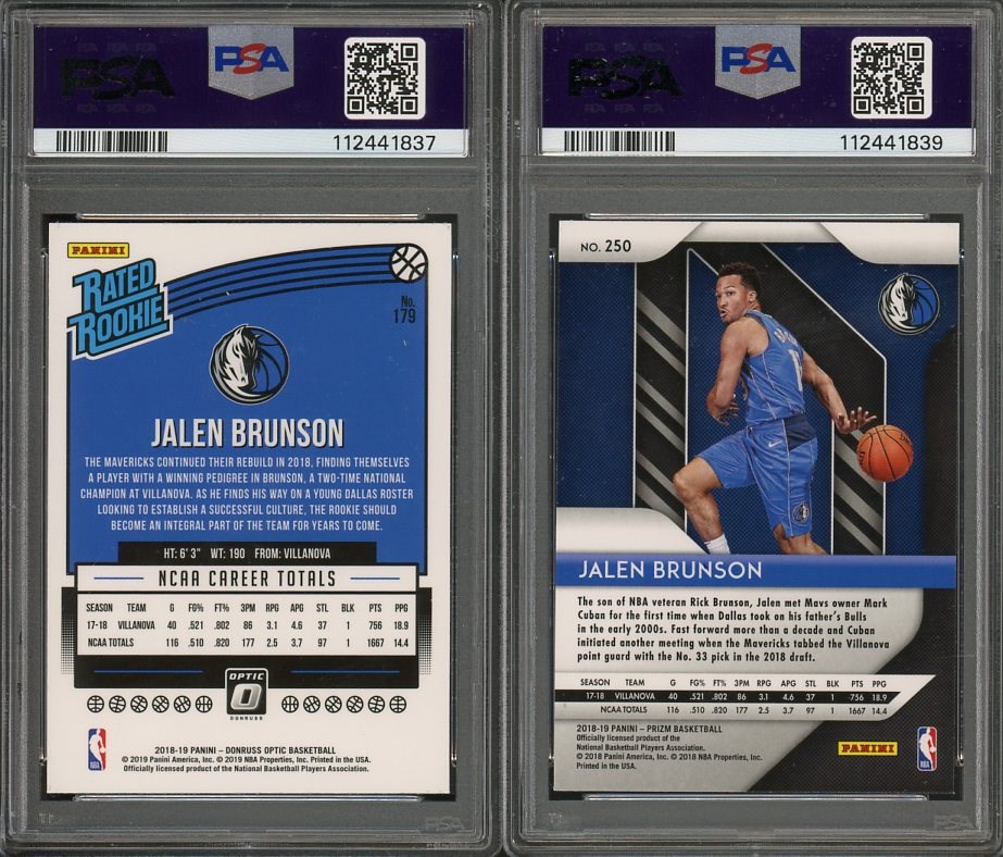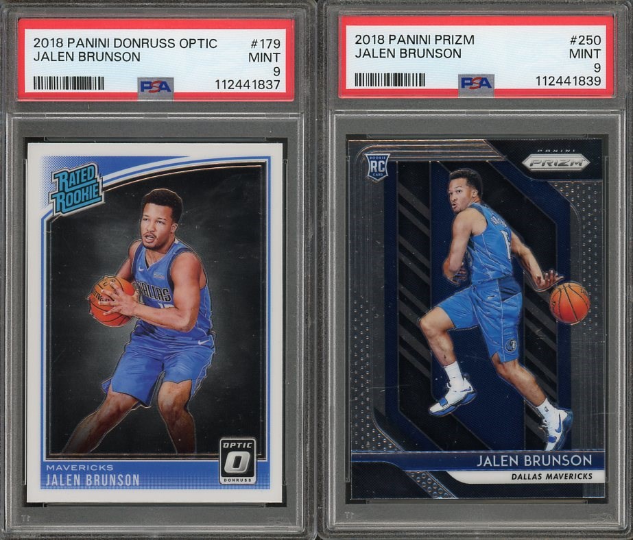 Jalen Brunson 2018 Panini Donruss Optic RC #179 and 2018 Panini Prizm RC #250  Both PSA Mint 9 - Hey Knicks fans, here is a great lot of two Brunson rookies to add to your collection.  His cards have really heated up over the last two seasons.