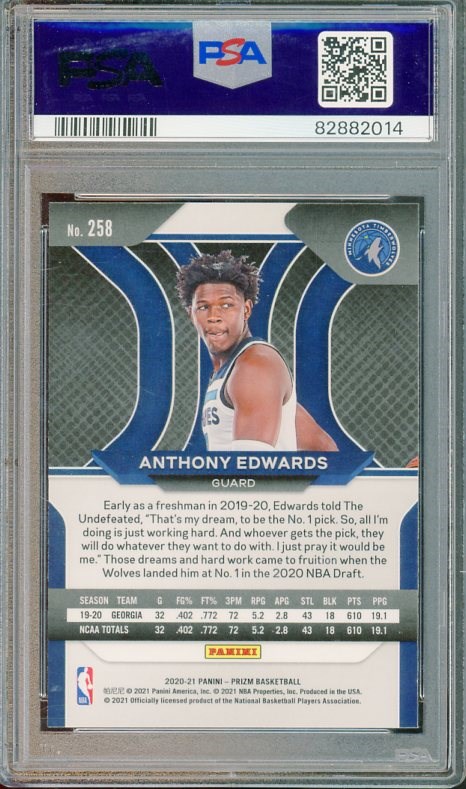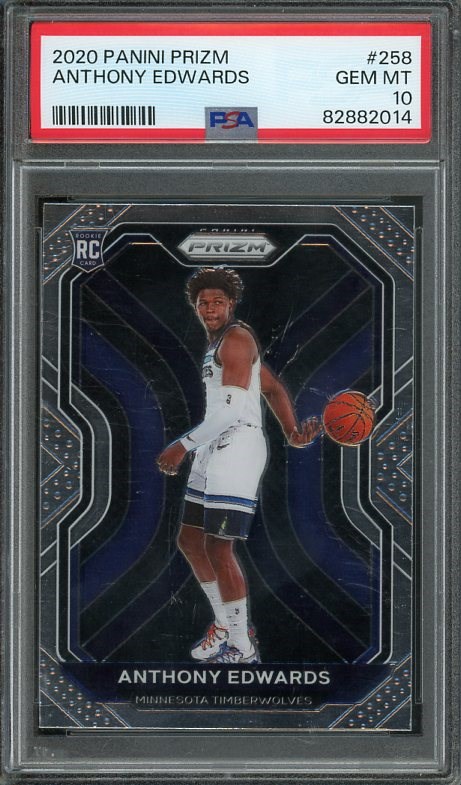 2020 Panini Prizm Anthony Edwards RC #258  PSA Gem Mint 10 - One of the league's top players, Edwards has led the Wolves to the conference finals in each of the last two seasons.  Here is his Panini Prizm rookie in PSA 10 grade.