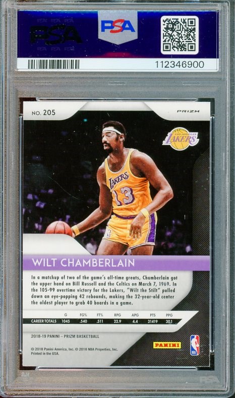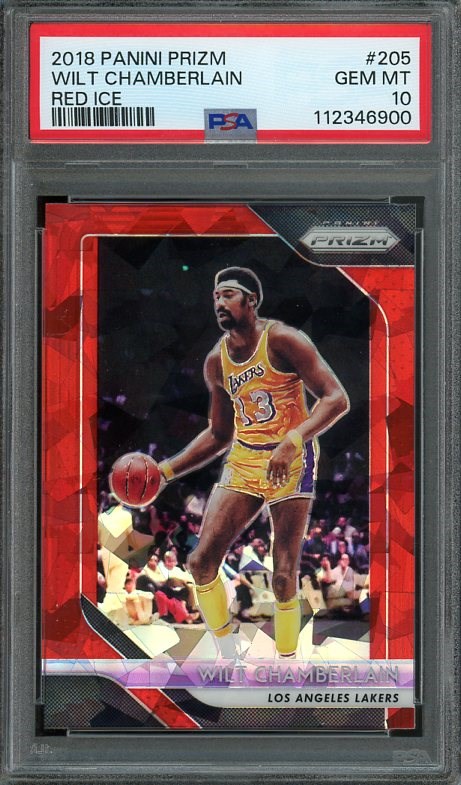 2018 Panini Prizm Wilt Chamberlain Red Ice Prizm #205  PSA Gem Mint 10 (Pop 3) - Another card from the large Panini Prizm collection, this Chamberlain has a PSA 10 population of just three.