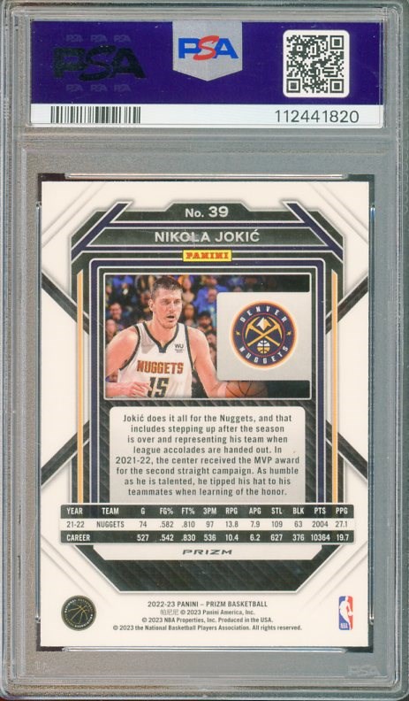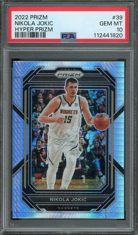 2022 Panini Prizm Nikola Jokic Hyper Prizm #39 PSA Gem Mint 10 (Pop 8) - A great silver design on this Hyper Prizm makes this card stand out. This card was recently graded and comes in a new PSA holder.
