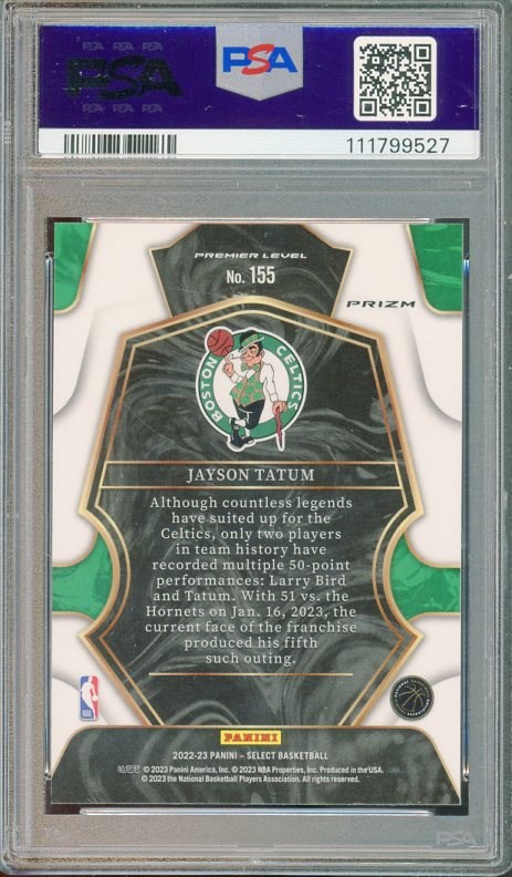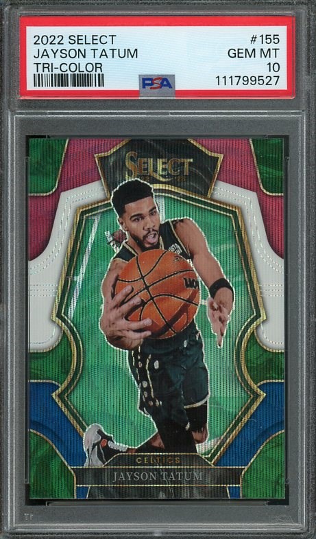 2022 Panini Select Jayson Tatum Tri-Color Prizm #155 PSA Gem Mint 10 (Pop 8) - This multi-colored design makes this Jason Tatum card special. Card and PSA holder are problem free.