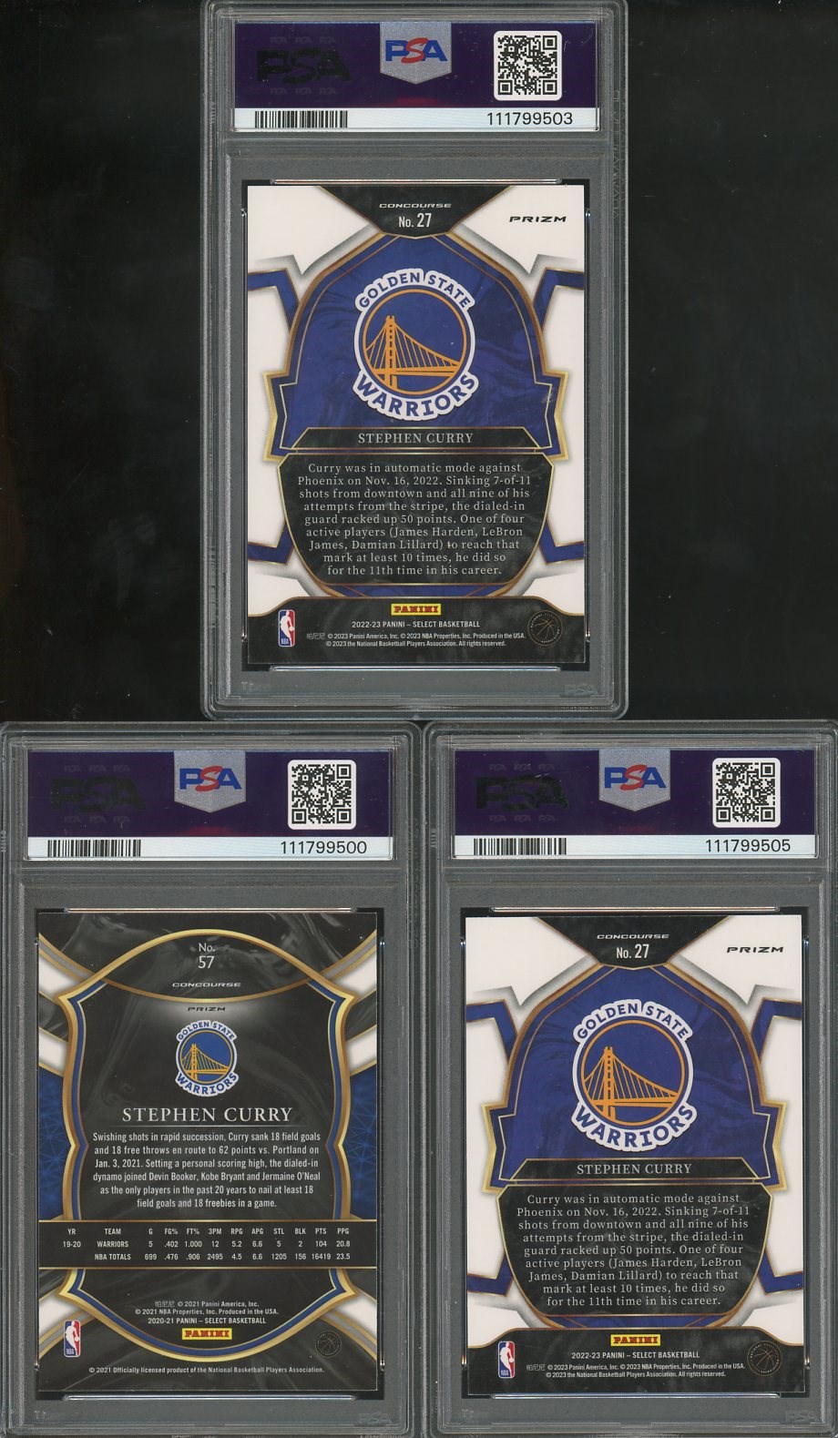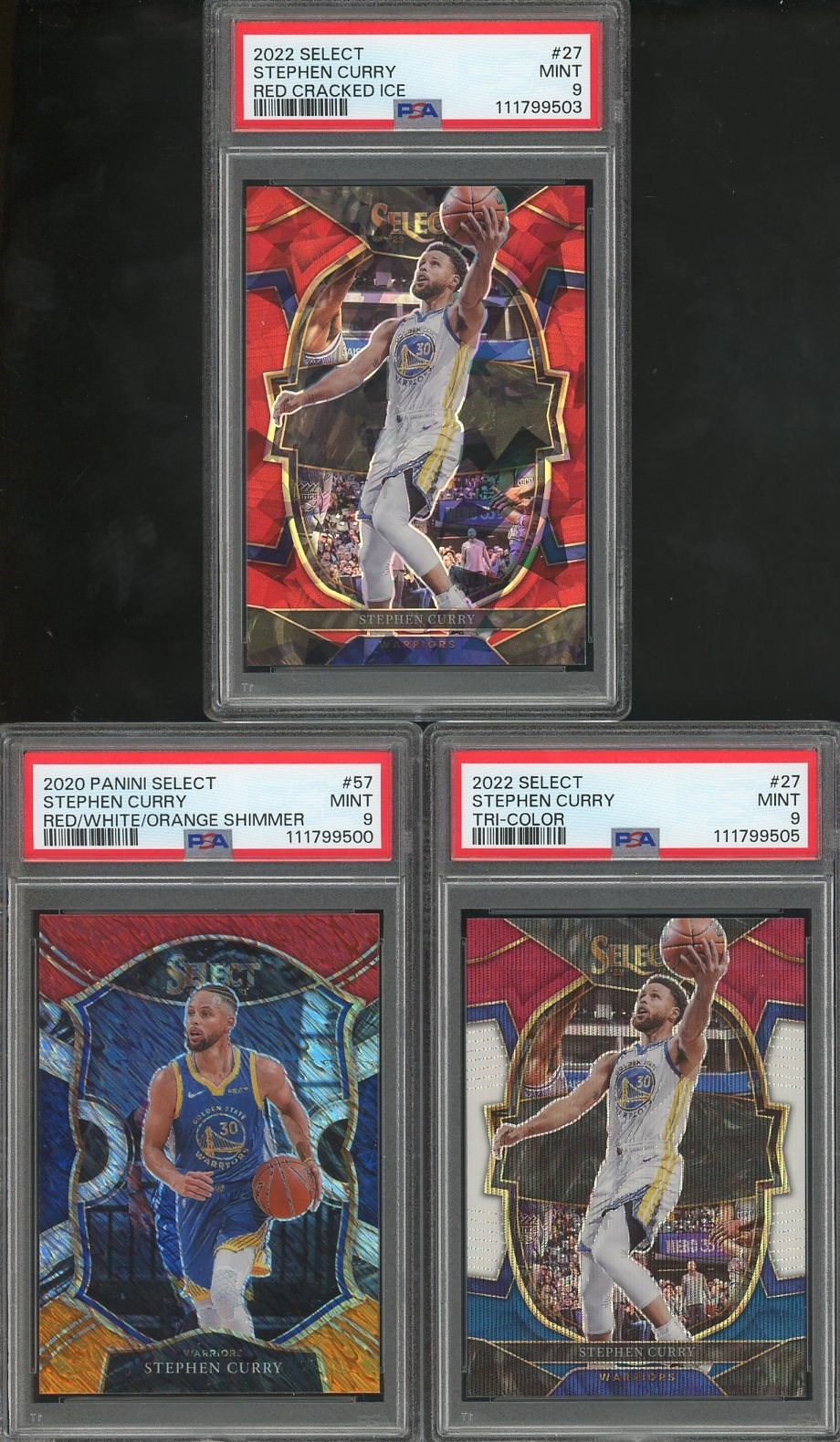 Lot of 3 Different Stephen Curry Panini Select Parallel Prizms PSA Graded - Includes his 2020 Panini Select Red/White/Orange Shimmer #57, 2022 Panini Select Tri-Color Prizm #27, and 2022 Panini Select Red Cracked Ice Prizm #27 all in PSA Mint 9 grade. Starting bid is just $10 per card!