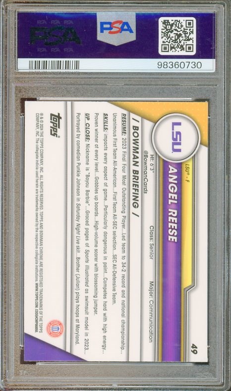 2023 Bowman U Chrome Angel Reese Pink Refractor #49 PSA Gem Mint 10 - The WNBA cards have really been gaining momentum in the last two years. Here is an Angel Reese Pink Refractor from the 2023 Bowman U Chrome product.