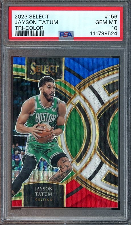 2023 Panini Select Jayson Tatum Tri-Color Prizm #156 PSA Gem Mint 10 (Pop 3) - Another colorful card offered for auction, this Jason Tatum Tri-Color Prizm has only three PSA 10's in existence.