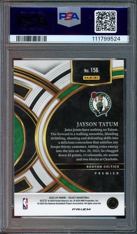 Lot # 828: 2023 Panini Select Jayson Tatum Tri-Color Prizm #156 PSA Gem Mint 10 (Pop 3)