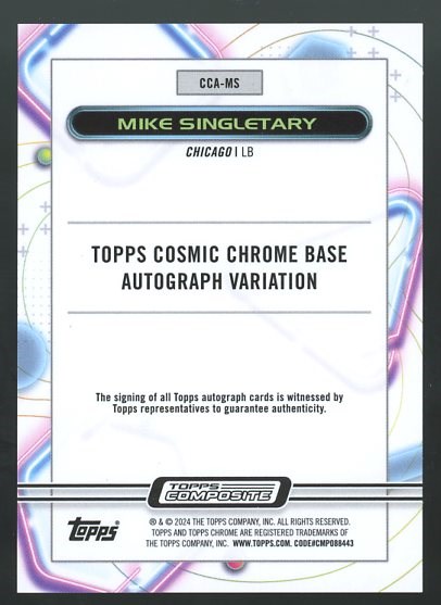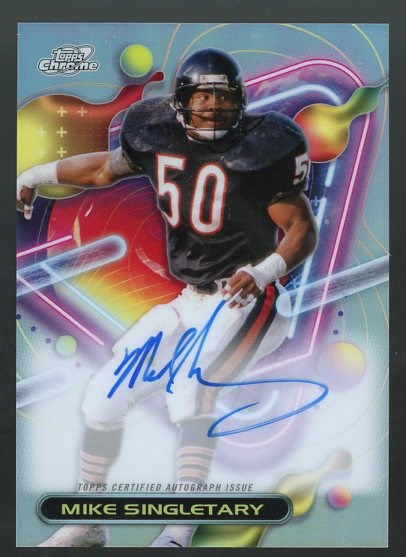 2024 Topps Chrome Mike Singletary Cosmic Chrome Autograph #CCA-MS - A nice, on-card signature of Bears legend Mike Singletary. A?HOFer and key contributor to their 1985 Super Bowl victory. Card is NM/MT?or better.