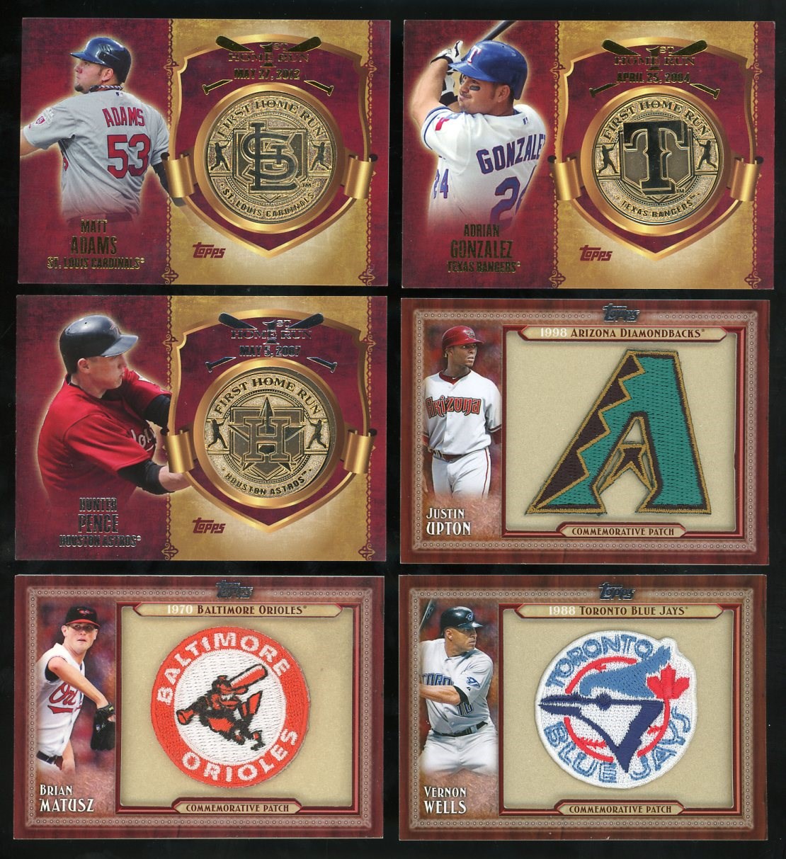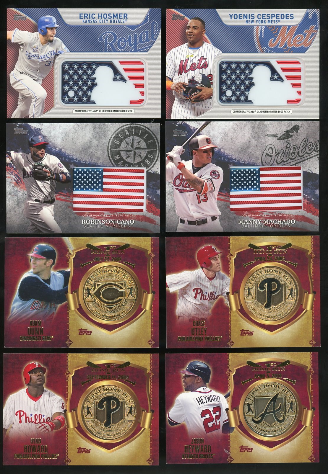 Lot of 22 Topps Commemorative Insert Cards w/HOFers - Lot includes the following: From 2021 Topps 70th Anniversary Logo Patch Cards of Ted Williams #T70P-TW, Rickey Henderson #T70P-RH, Randy Johnson #T70P-RJ, Roger Clemens #T70P-RCL, Ozzie Smith #T70P-OS. From 2017 Topps Independence Day Batter Logo Patch Joey Votto #IDML-JVO, Paul Goldschmidt #IDML-PG, Byron Buxton #IDML-BB, Eric Hosmer #IDML-EH, Yoenic Cespedes #IDML-YC. From 2018 Topps Independence Day US Flag Day Patch Card Robinson Cano #IDML-RC, Manny Machado #IDML-MM. From 2015 Topps1st Home Run Medallions Adam Dunn #FHRM-AD, Chase Utley #FHRM-CU, Jason Heyward #FHRM-JHE, Ryan Howard #FHRM-RH, Matt Adams #FHRM-MA, Adrian Gonzalez #FHRM-AG, Hunter Pence #FHRM-HP. From 2011 Topps Throwback Manufactured Patch Cards of Justin Upton #JU, Brian Matusz #BMA and Vernon Wells #VW.