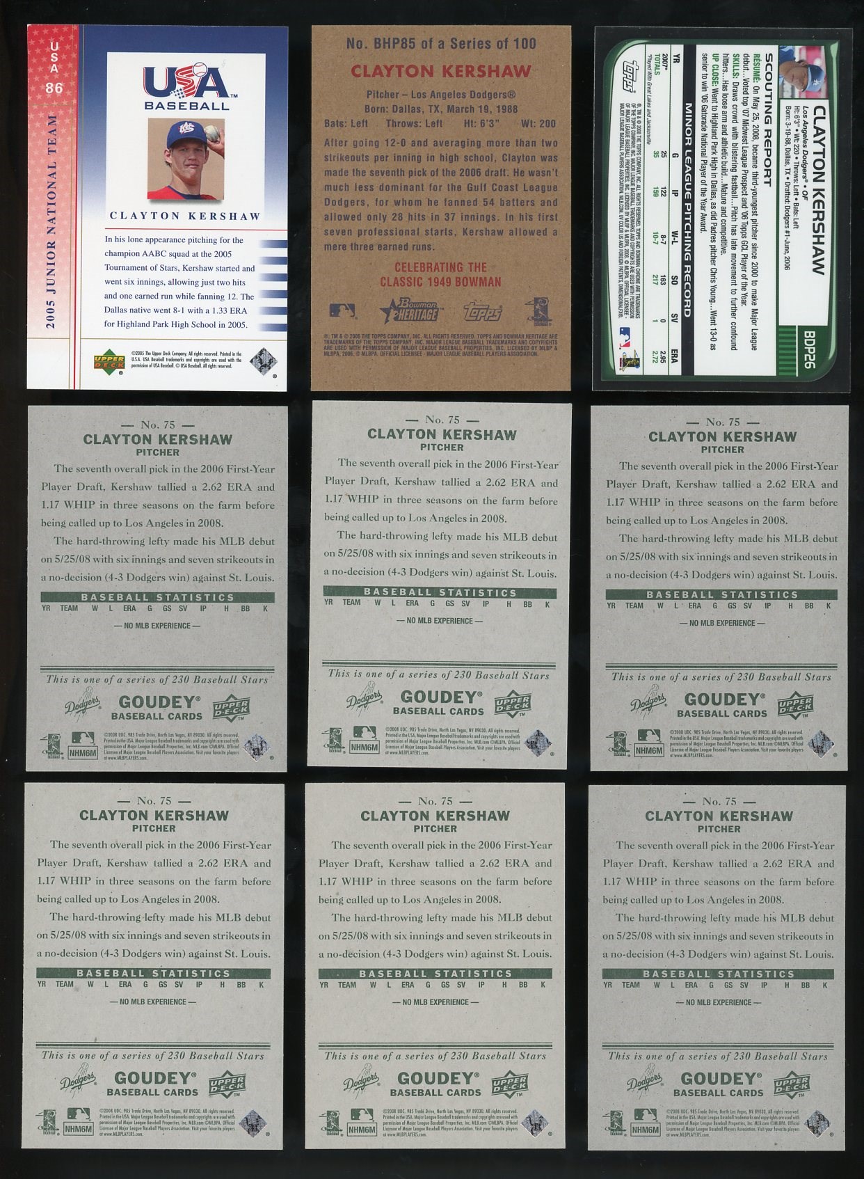 Lot of 9 Clayton Kershaw Rookie Cards - Lot includes 2005 Upper Deck Team USA #86, 2008 Bowman Heritage RC #BHP85, 2008 Bowman Chrome Draft RC #BDP26, and (6) 2008 Upper Deck Goudey RC #75. Kershaw just became the 20th player in MLB history to achieve 3,000 strikeouts.