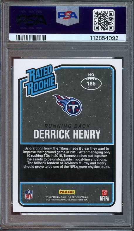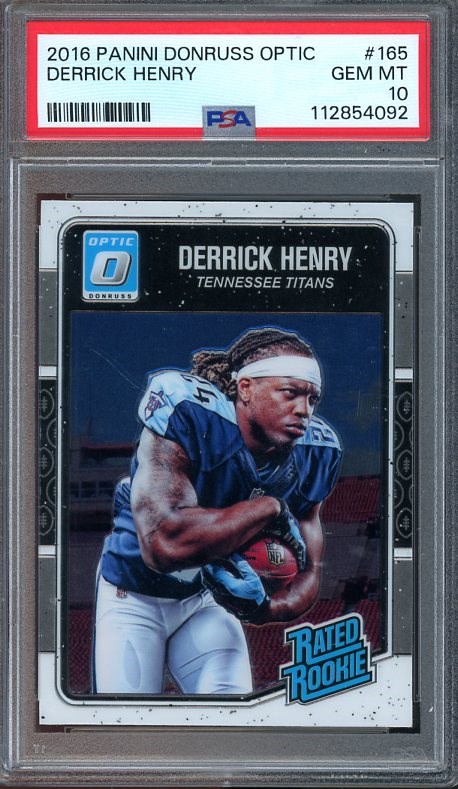 2016 Panini Donruss Optic Derrick Henry RC #165 PSA Gem Mint 10 - One of Henry's top tier rookies, this Optic received a Gem Mint 10 grade from PSA and comes in a new PSA holder.